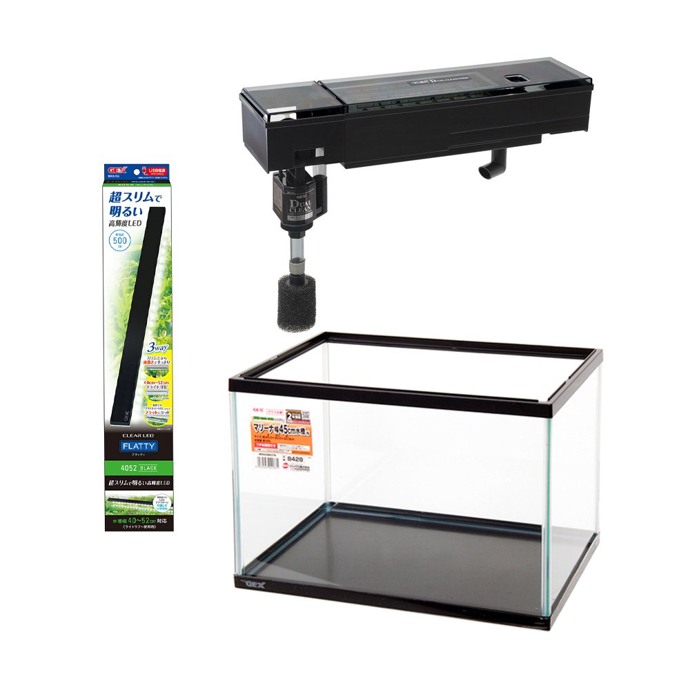 なお、「45cm水槽」+「上部式フィルター」+「照明」を組み合わせたものが各社から販売されており、その一式セットを用いればアイテム選びに迷うことがありません。