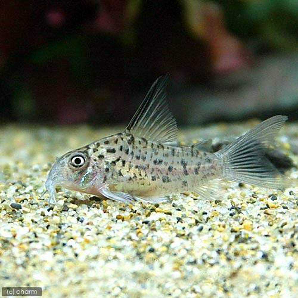 角ばった頭部と、体サイズの割に大きな目を持ち、体にはごま塩のようなスポットが入る愛らしいコリドラスです。
